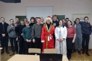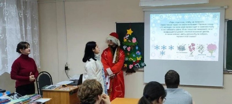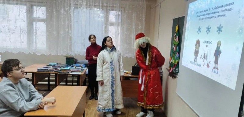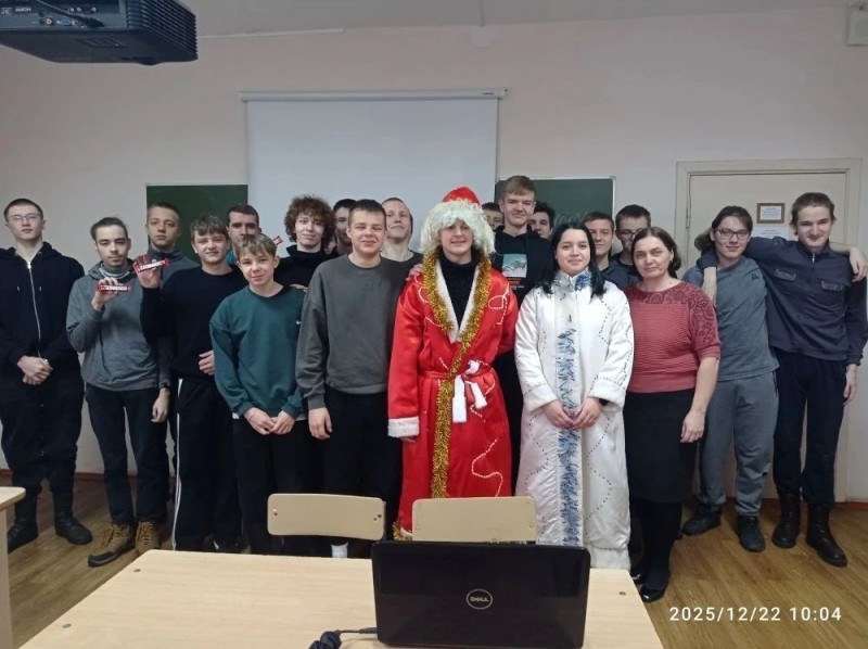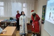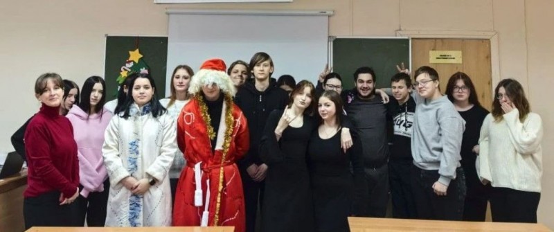 В преддверии празднования Нового года к студентам групп 273-ТМ-1(Профессионалитет), 276-ПКД-1 в гости пришли Дед Мороз и Снегурочка (студенты «Движения Первых» - Булысов Максим и Руковичникова Анна).